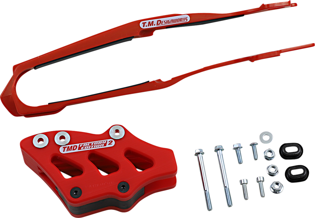 Chain Guide/Slider - Honda - Red Chain Guide and Slider Kit The kit includes dirt cross chain slider, lower powerlip roller or frame pad, and rear chain guide (either factory edition #1 or #2) The dirt cross sliders are made from the TMD compression-injected propriety plastic Most dirt cross sliders have noise-reducing dampening pad installed Fitment: