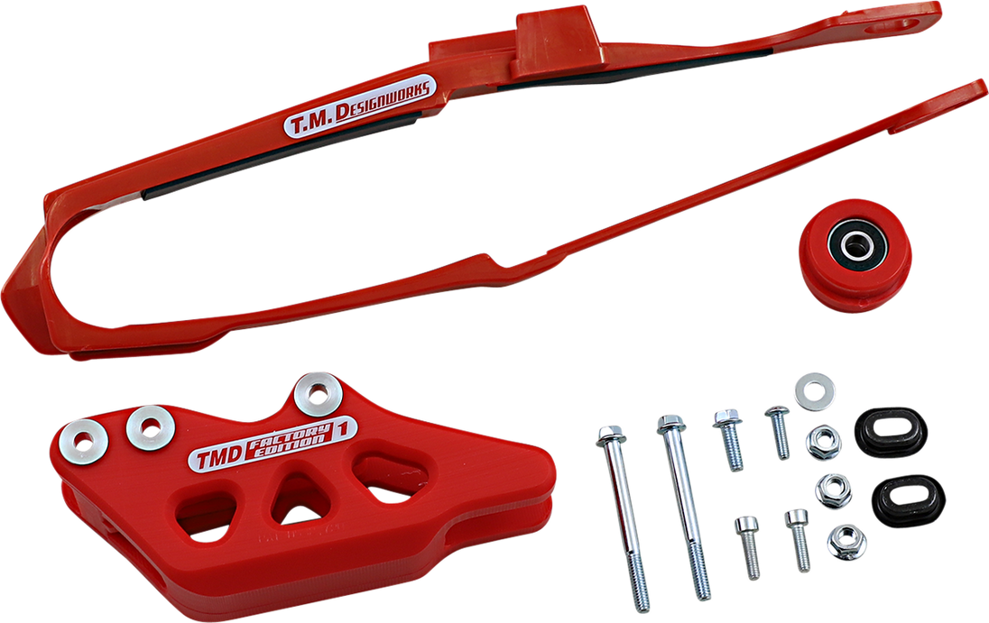 Chain Guide/Slider - Honda - Red Chain Guide and Slider Kit The kit includes dirt cross chain slider, lower powerlip roller or frame pad, and rear chain guide (either factory edition #1 or #2) The dirt cross sliders are made from the TMD compression-injected propriety plastic Most dirt cross sliders have noise-reducing dampening pad installed Fitment: