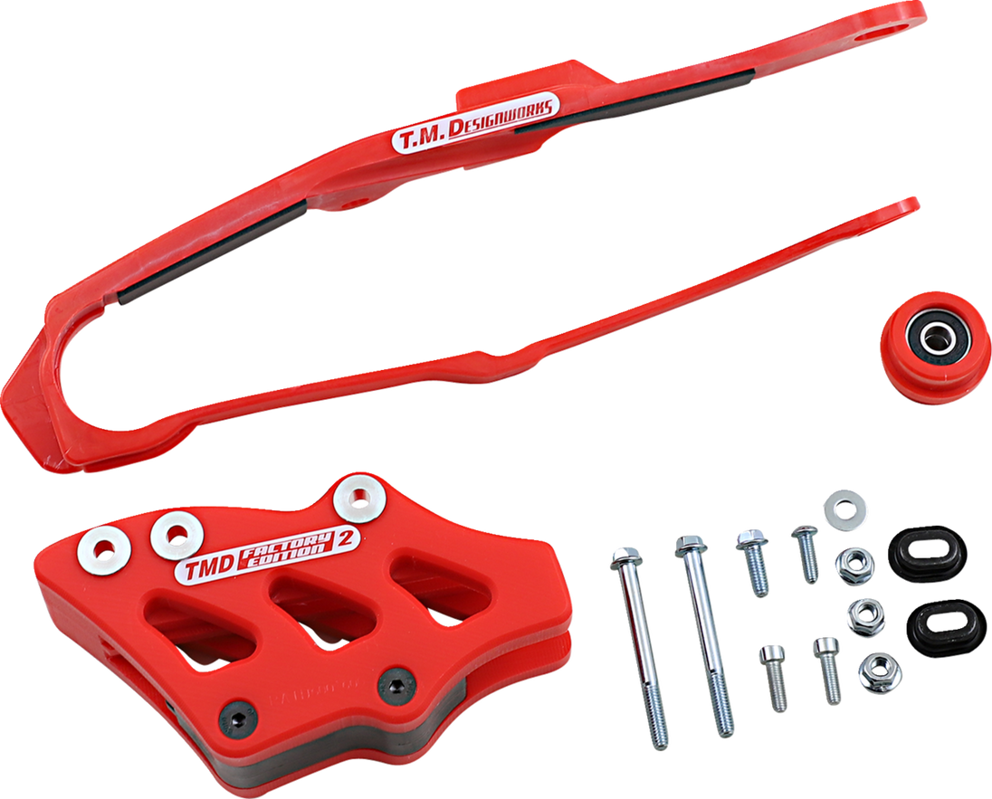 Chain Guide/Slider - Honda - Red Chain Guide and Slider Kit The kit includes dirt cross chain slider, lower powerlip roller or frame pad, and rear chain guide (either factory edition #1 or #2) The dirt cross sliders are made from the TMD compression-injected propriety plastic Most dirt cross sliders have noise-reducing dampening pad installed Fitment: