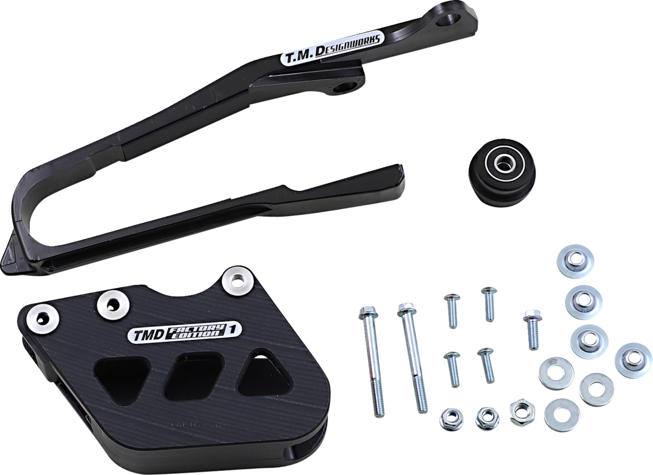 Chain Guide/Slider - Suzuki - Black Chain Guide and Slider Kit The kit includes dirt cross chain slider, lower powerlip roller or frame pad, and rear chain guide (either factory edition #1 or #2) The dirt cross sliders are made from the TMD compression-injected propriety plastic Most dirt cross sliders have noise-reducing dampening pad installed Fitment: