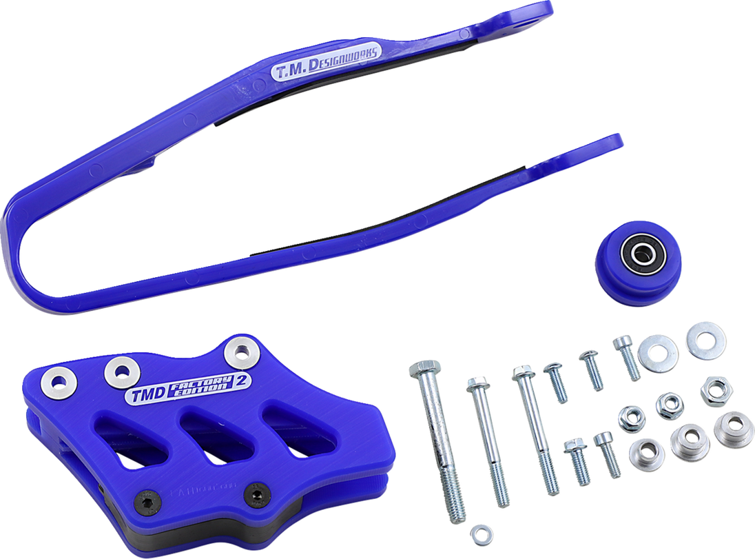 Chain Guide/Slider - Yamaha - Blue Chain Guide and Slider Kit The kit includes dirt cross chain slider, lower powerlip roller or frame pad, and rear chain guide (either factory edition #1 or #2) The dirt cross sliders are made from the TMD compression-injected propriety plastic Most dirt cross sliders have noise-reducing dampening pad installed Fitment: