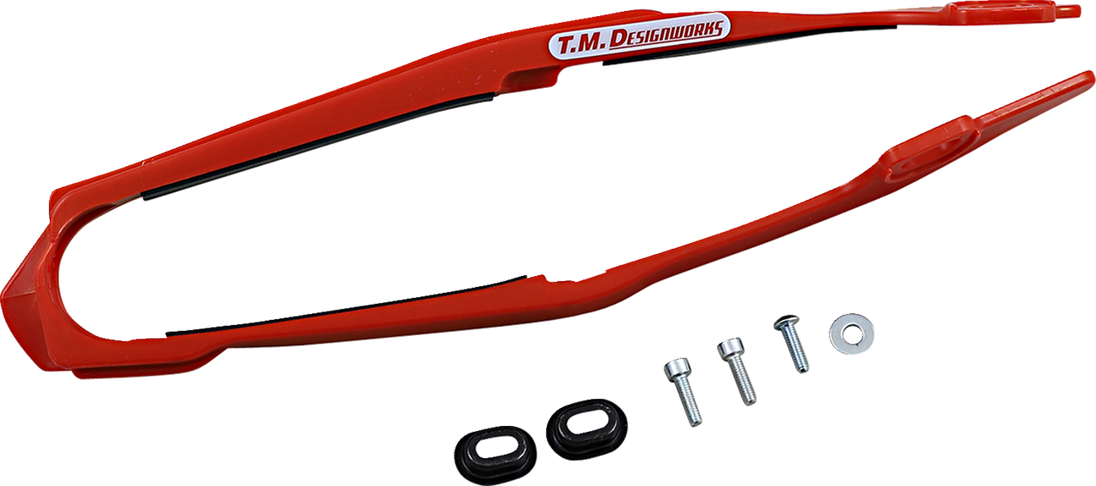 Chain Slider - Honda - Red Chain Slider Precision made by TMD with our exclusive oil additive low friction chain material Race tested with our rear plate tab that keeps the chain in line and reduces loose chain problems Comes with our noise dampening pads and testing has shown this to be an improvement over stock Material will last considerably longer than inexpensive stock slider and uses stock hardware UV protected again color fade and aging Fitment: