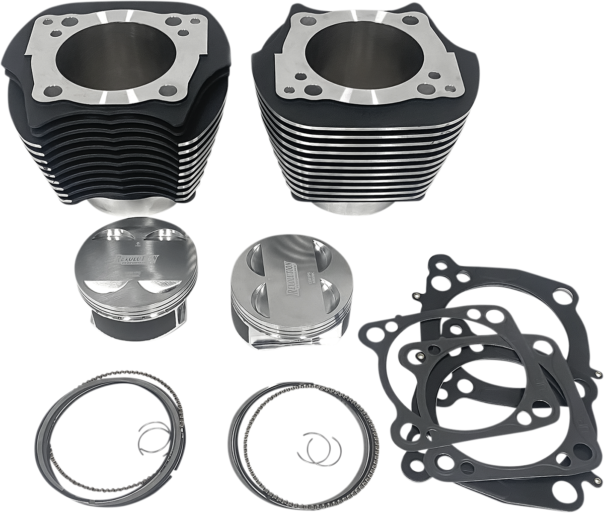Cylinder Kit - 124" - Black with Highlighted Fins - M8 Cylinder Kit Aerospace-grade all-aluminum cylinder with nickel-silicon-carbide (NSC) electroplated bore No sleeving allows for larger bore sizes NSC-plated cylinders have less friction for increased horsepower, lower engine temperatures and a longer lifespan Monster big bore kits will require case boring Includes pair of all-aluminum NSC-coated bore cylinders, custom-forged pistons with high-tension rings specifically designed for NSC cylinders and a head/base gasket set Replacement gasket sets available separately Upgraded cylinders studs and head bolts recommended Made in the USA Fitment: