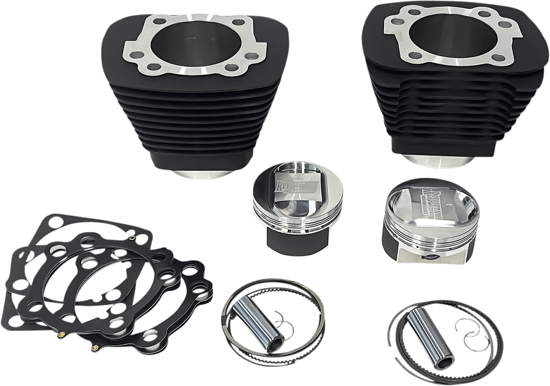 Cylinder Kit - 1250 cc - Black Cylinder Kit Aerospace-grade all-aluminum cylinder with nickel-silicon-carbide (NSC) electroplated bore No sleeving allows for larger bore sizes NSC-plated cylinders have less friction for increased horsepower, lower engine temperatures and a longer lifespan Monster big bore kits will require case boring Includes pair of all-aluminum NSC-coated bore cylinders, custom-forged pistons with high-tension rings specifically designed for NSC cylinders and a head/base gasket set Replacement gasket sets available separately Upgraded cylinders studs and head bolts recommended Made in the USA Fitment: