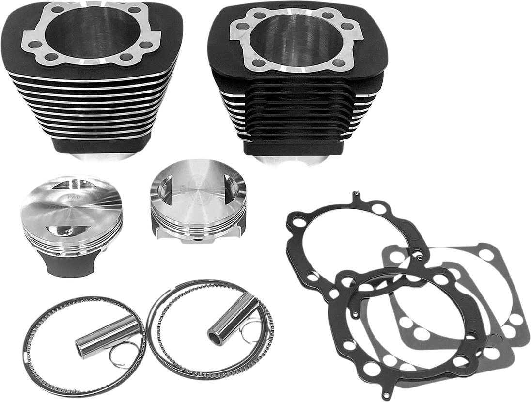 Cylinder Kit - 90" - Black with Highlighted Fins - XL Cylinder Kit Special Instructions: Not for XR1200 models Not for XR1200 models Aerospace-grade all-aluminum cylinder with nickel-silicon-carbide (NSC) electroplated bore No sleeving allows for larger bore sizes NSC-plated cylinders have less friction for increased horsepower, lower engine temperatures and a longer lifespan Monster big bore kits will require case boring Includes pair of all-aluminum NSC-coated bore cylinders, custom-forged pistons with high-tension rings specifically designed for NSC cylinders and a head/base gasket set Replacement gasket sets available separately Upgraded cylinders studs and head bolts recommended Made in the USA Fitment: