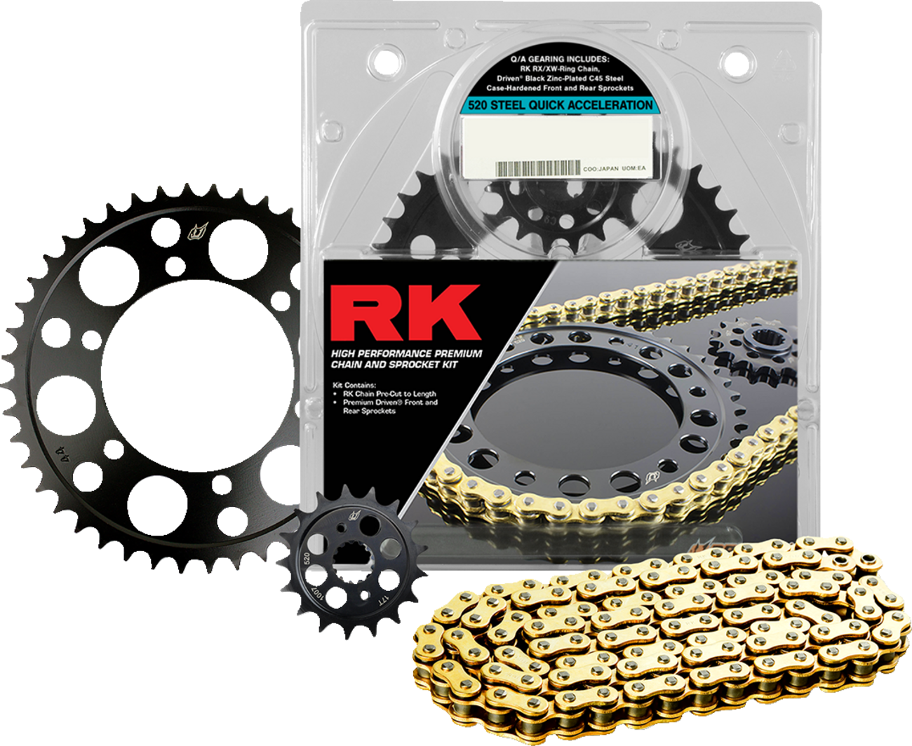 Chain Kit - Gold- Yamaha - YZF-R1 '09-'14 Quick Acceleration Chain Kit Kit includes a premium Driven® C45 steel alloy black case hardened rear sprocket paired with Driven® C45 steel case hardened and quenched front sprocket RK’s 520 Steel Quick Acceleration Race Kit combines the enhanced performance of race gearing and durability of steel components Kit includes a one-tooth-smaller-than-OE front sprocket Fitment: