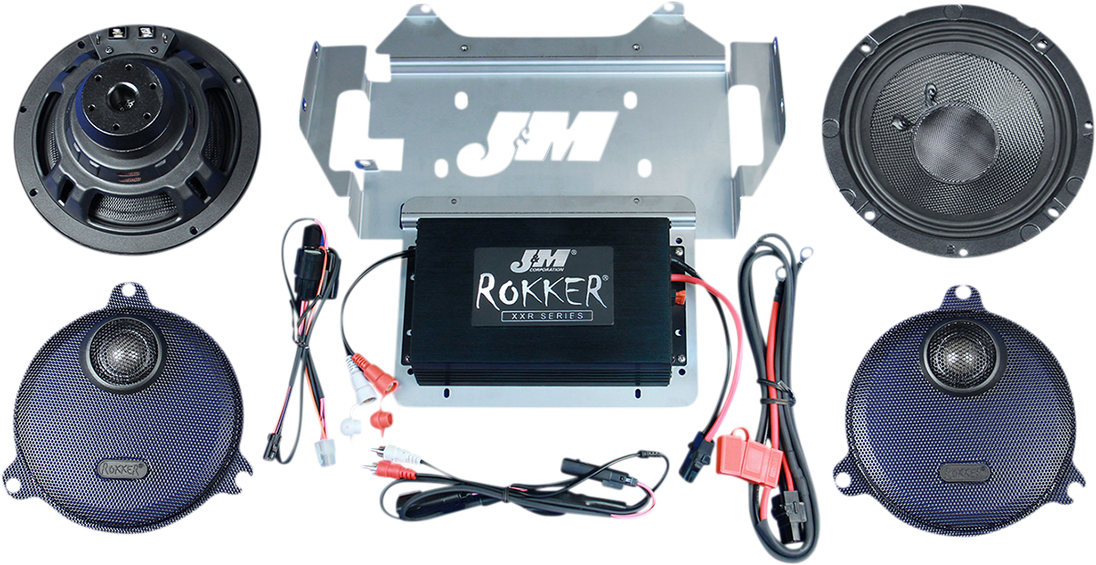 400w 2-Speaker/Amplifier - Street Glide/Ultra ROKKER® XXR EXTREME 400w 2-Speaker/Amplifier Installation Kit Kit includes a full range class D audio amplifier, spec'd at 200watts RMS per channel X2, (400w total) into 2-ohm load @ 14.4vdc with dimensions of 7-1/4" x 4-3/4" x 1-3/4" Amplifier mounts to custom made stainless steel 2-piece bracket system, to provide solid and secure mounting inside the fairing J&M's ROKKER XXR series 6.71" speakers designed as exact size component/replacements for the stock 6.5" Harley fairing speakers Spec'd at 2 ohms impedance and 300 watts maximum input (200w RMS - 91db sensitivity), speakers provide the ultimate in raw audio power and include the new custom grills with built-in high-output tweeters Lightweight waterproof one-piece woven-fiber driver cone with super-rigid metal basket design High-density lite-weight Neodymium magnet structure, specially coated to maintain flux-strength integrity even at extreme operating temperatures High efficiency VENTED voice-coil for improved cooling when operating at high volume levels for extended periods Mounting hole pattern and spade electrical connections are exactly the same as the factory specification, this is a total plug-and-play no-modification solution complete with easy to follow installation instructions. Custom made plug-n-play wiring harnesses included, along with heavy gauge power/ground wires for the fused battery connection, all necessary mounting hardware & complete installation/operation instructions. Fitment: